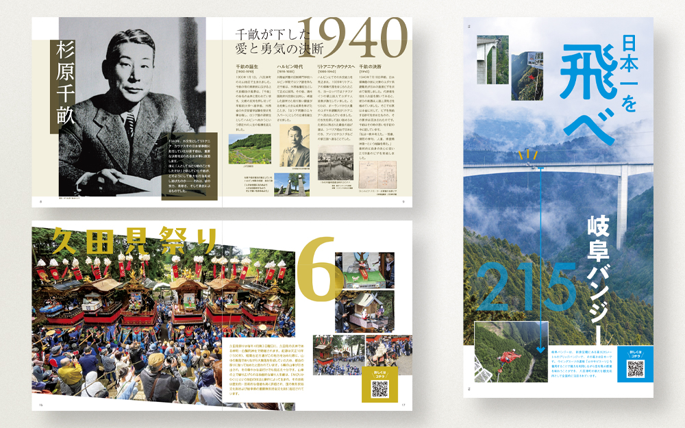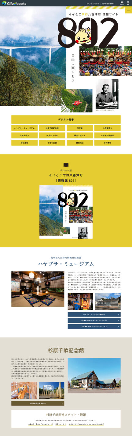 本件で制作するパンフレットのイメージを踏襲し、内容を補完する特設ウェブサイトをギフイーブックス公式サイト内に開設しました。特設ウェブサイトに掲載する情報は、QRコード化しパンフレットに掲載してますので、観光情報に限らず、移住定住、ふるさと納税、子育て支援など幅広い情報へアクセスを広げる設計となっています。