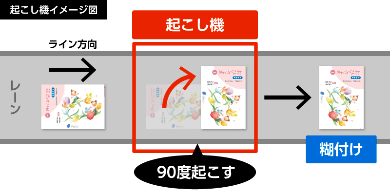レーンに沿って進む刷本を「起こし機」が自動で90°起こすことで、横本の短辺への糊付けが可能になります。