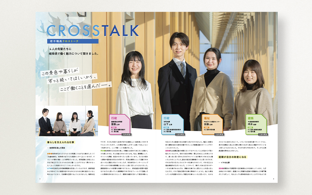 次世代の県政を担う優秀な人材を確保するため、就職を考えている若者に対して、岐 阜県職員の仕事の魅力や業務内容等を紹介した職員採用案内パンフレットを制作する。
