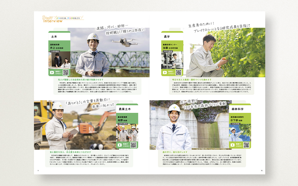 文字数を減らし写真を大きく見せるレイアウトと、余白を活かしスッキリ読みやすいデザインをラフ案を作成し提案。手書きフォントをつかったコピー挿入で柔らかい印象もプラスしました。表紙が県内高校生の描いたイラストを使う仕様でしたが、中面のデザインとイメージが離れすぎない様、イラストの描き方も提案をしつつ県と協議を重ねました。