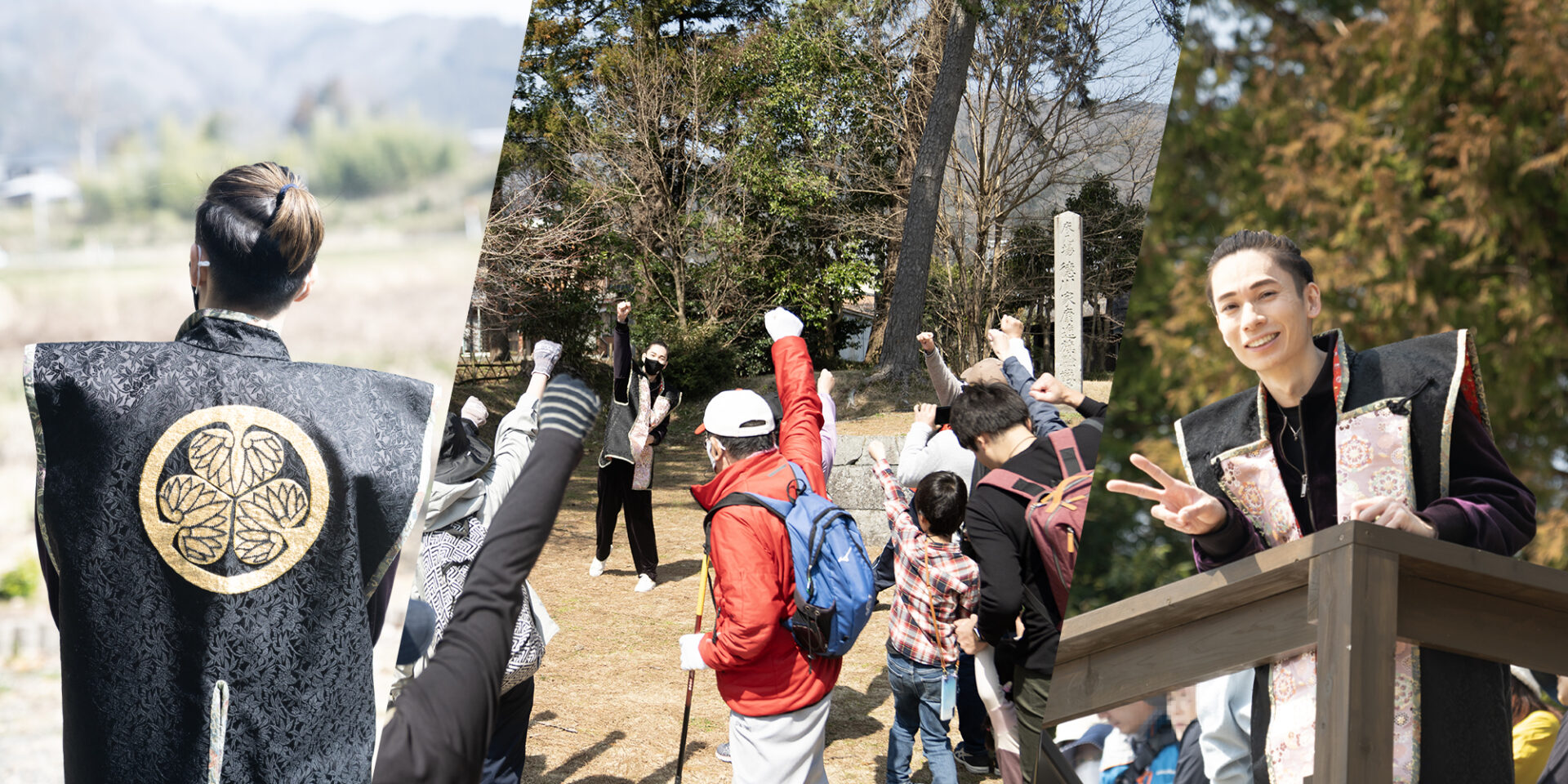 徳川家康公が着用した黒い鎧兜(レプリカ)を着用して、宣材広告用の撮影を関ケ原町内で行った他、町内を巡るガイドウォーキングの先導役ガイドとしても起用しました。また、関ケ原合戦で徳川家康が最初に陣を敷いた桃配山での本陣再現では、関ケ原町の備品に加え、本染めの葵の御門入り陣幕を新規で制作するとともに、大河ドラマや時代劇映画などで小道具やセットを制作・提供している高津装飾美術株式会社様より陣盾や篝火などの備品をレンタルし、よりリアルな本陣再現に努めました。