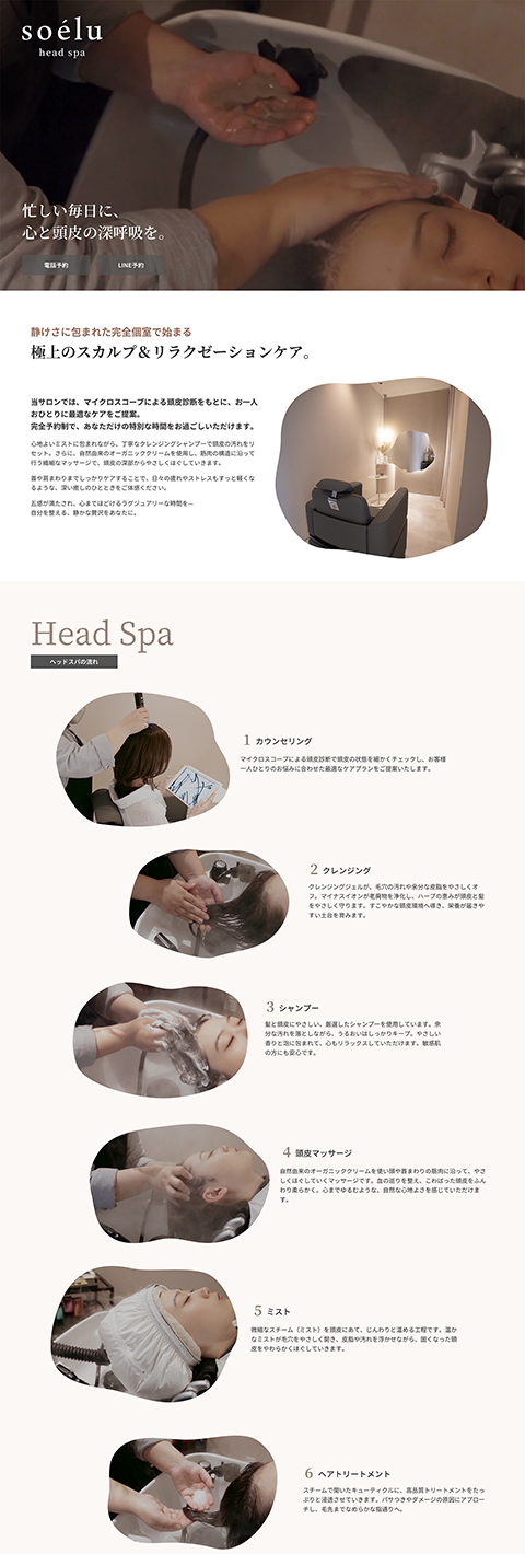 広告の遷移先となるLP(特設サイト)は、この先の修正更新を自ら行いたいのと、期間限定のLPになるので低コストでの運用をご希望。お客様の使い慣れた『Canva』を使うことで安価で引き継ぎのしやすいサイトへ。動画のイメージに沿ったデザインで、ヘッドスパの工程や金額など詳細を掲載することで、広告から入ってきた人が、より詳しいサービスの説明やお店の雰囲気を知ることができる構成で制作しました。